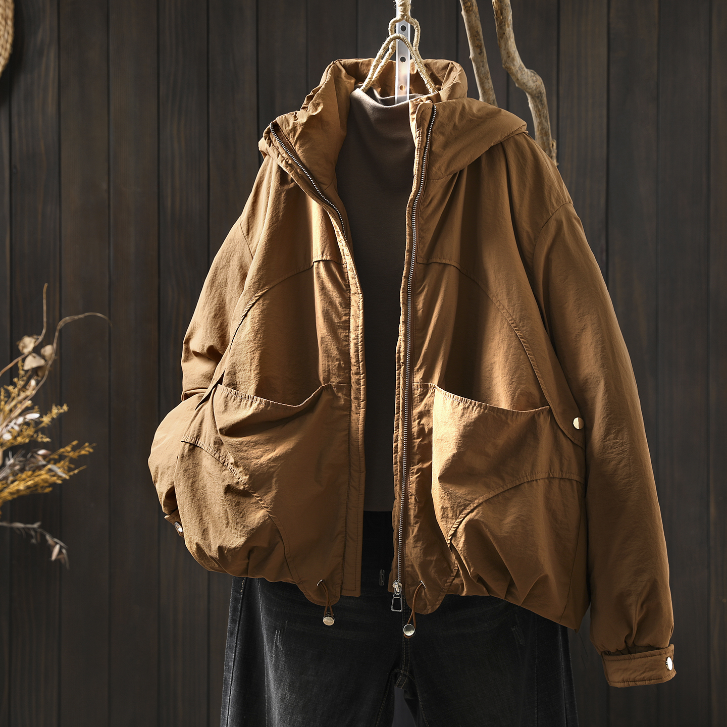 超好看夹棉薄外套女2025冬新连帽小个子短款设计感宽松双口袋棉服