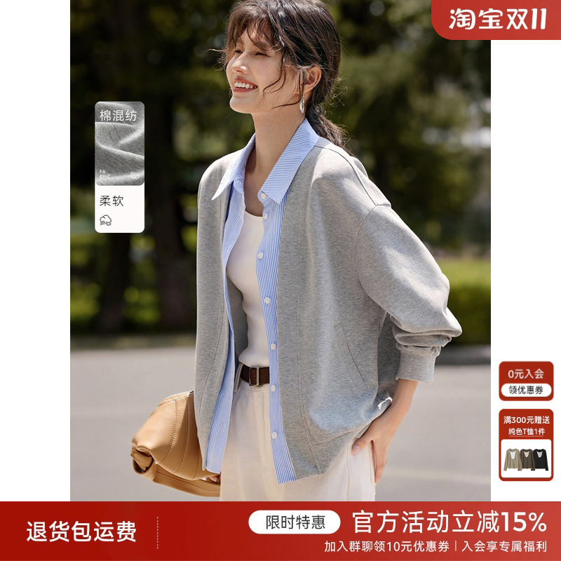 XWI欣未莱赛尔棉针织薄外套女早秋新款假两件拼接衬衫领休闲上衣