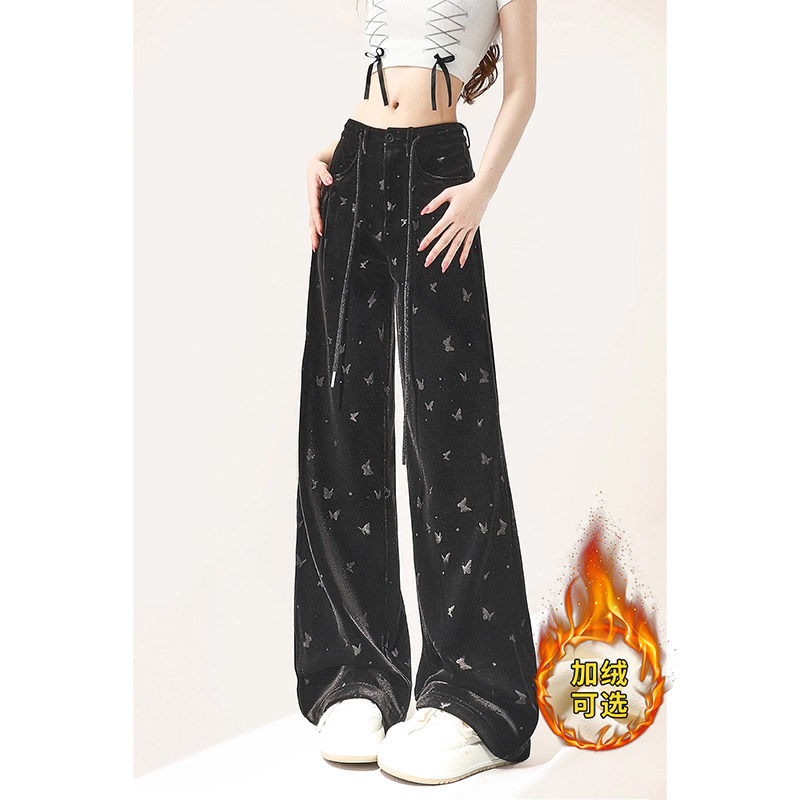 自然涩黑色蝴蝶金丝绒国风阔腿裤女秋冬季加绒高级垂感休闲裤子厚