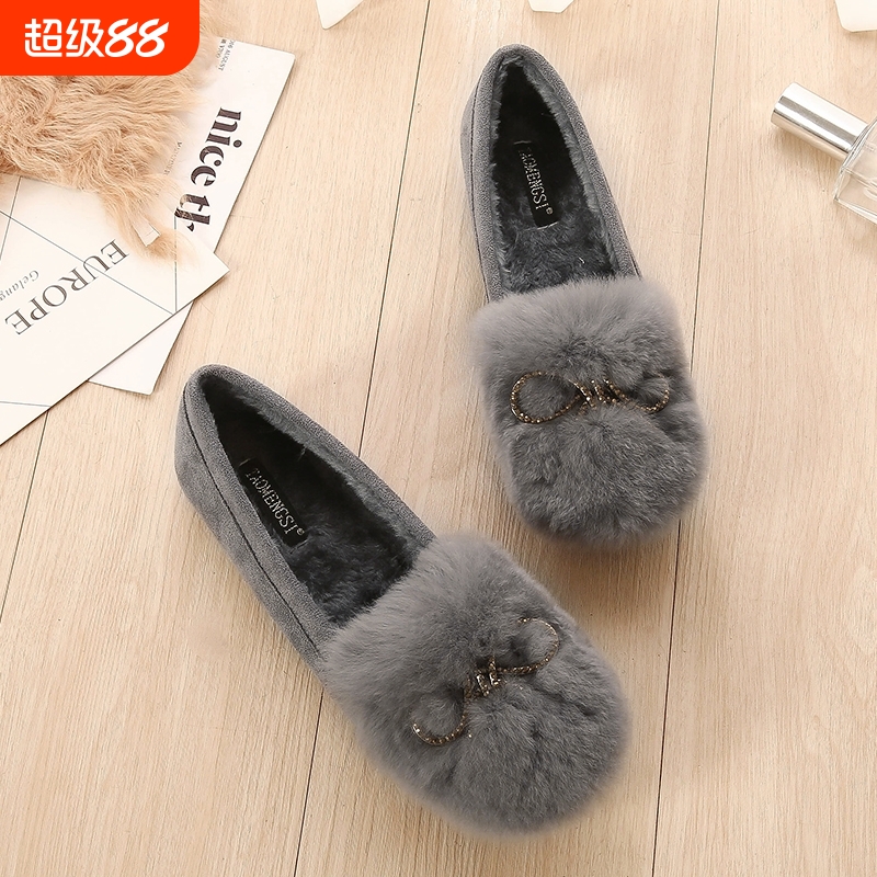 网红超火玛丽珍毛毛鞋女加绒保暖豆豆棉鞋一脚蹬复古平底温柔单鞋