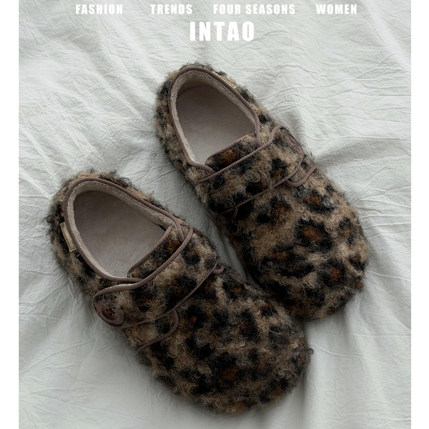 复古豹纹玛丽珍毛毛鞋女冬加绒2025新款保暖软底豆豆棉鞋纽扣单鞋