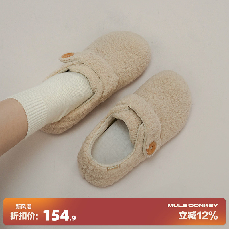 多嘴驴Donkey白色毛毛鞋女秋冬外穿平底加绒豆豆鞋羊羔毛保暖棉鞋