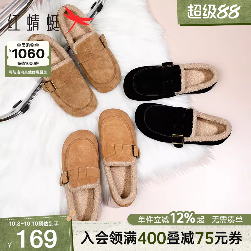 红蜻蜓雪地靴女冬季款女鞋加绒勃肯豆豆一脚蹬鞋子舒适棉鞋毛毛鞋