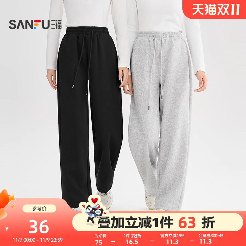 三福休闲裤2025新款秋季舒适针织裤子宽松bf慵懒风黑色直筒裤女装