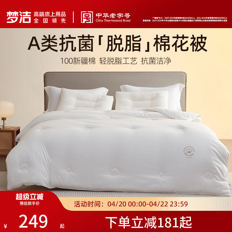 梦洁家纺100新疆棉花被子春秋被冬被A类抗菌加厚保暖脱脂棉被芯