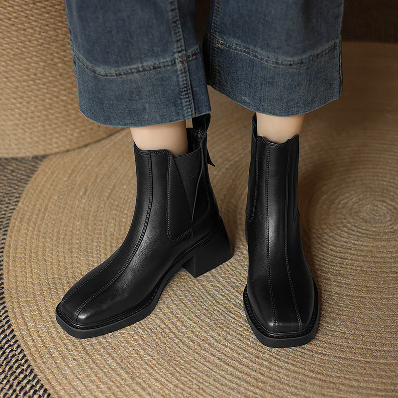 fed法式复古羊皮粗跟切尔西靴女秋冬新款气质方头高跟瘦瘦小短靴