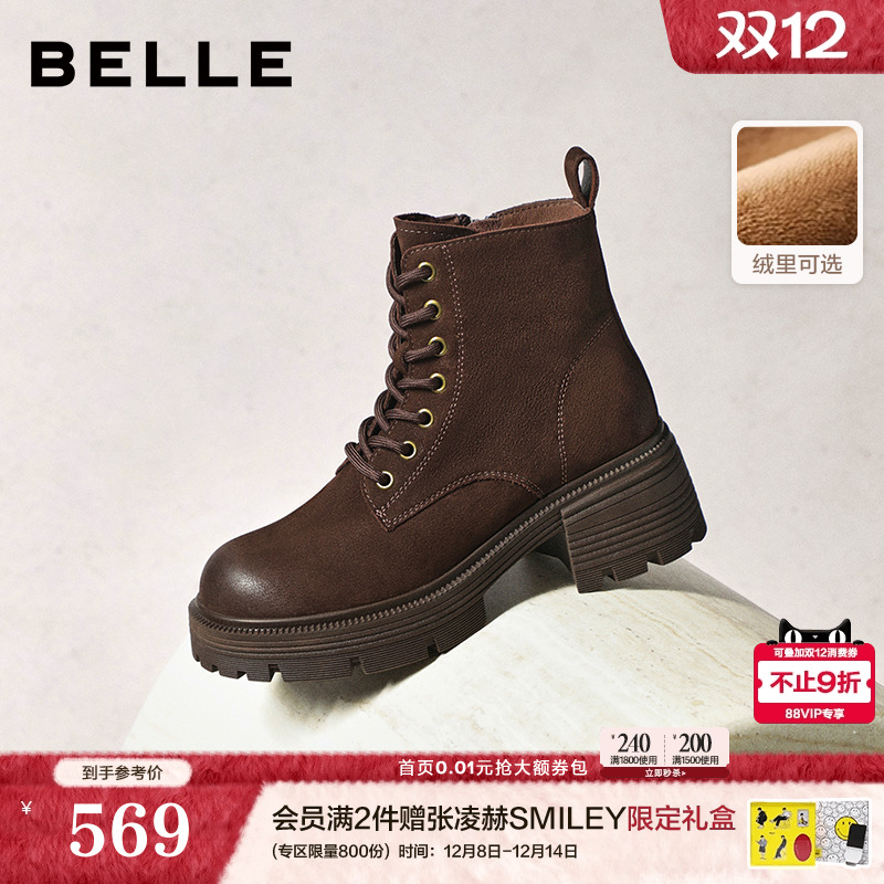 百丽复古厚底增高加绒保暖马丁靴女鞋冬款粗跟休闲短靴子E8V1DDD5