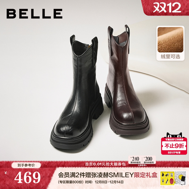 百丽复古加绒弹力靴女25冬季新款厚底粗跟显瘦瘦靴短靴子E5E1DDZ5