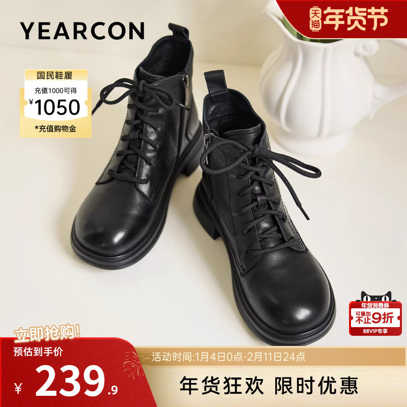 意尔康女鞋2025冬季皮鞋复古真皮休闲马丁靴粗跟英伦加绒保暖短靴