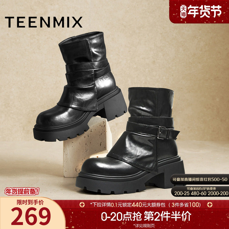天美意复古厚底增高时装靴堆堆靴女鞋子粗跟短靴皮靴2025冬季新款