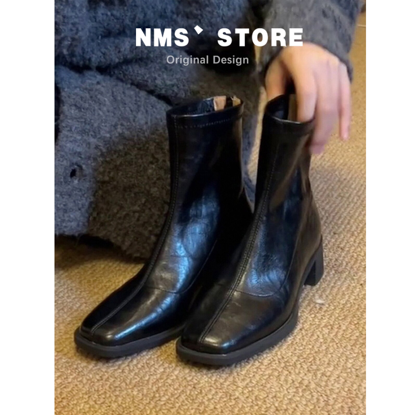 【跟高6cm】复古真皮瘦瘦靴方头显瘦秋冬新款高跟短靴粗跟弹力靴