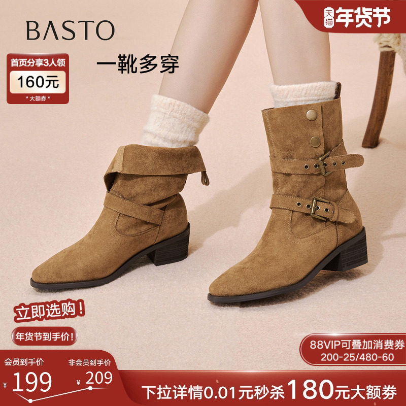 百思图2025冬季新款复古西部牛仔靴堆堆靴尖头粗跟女短靴BP019DZ5
