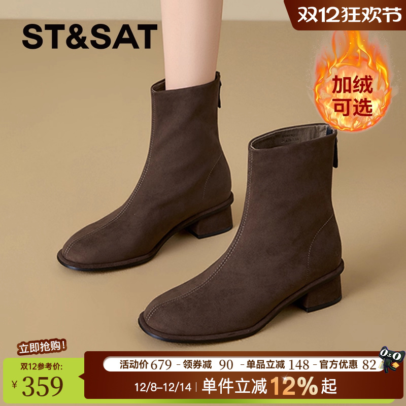 星期六2025新款复古短靴女粗跟圆头百搭瘦瘦靴冬季加绒保暖时装靴