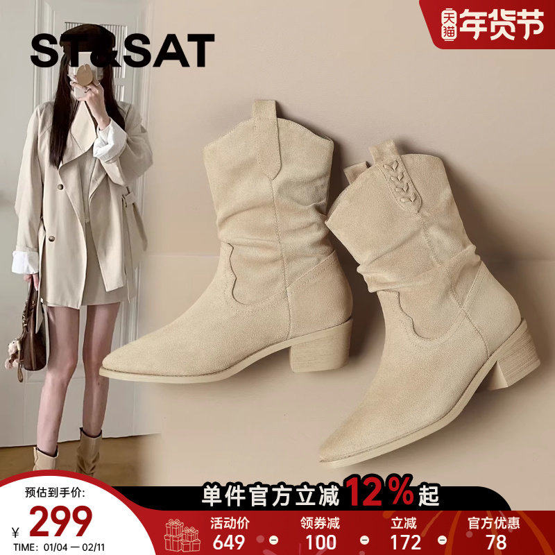 星期六复古短靴女2025冬尖头堆堆靴粗跟骑士靴套筒西部中筒瘦瘦靴