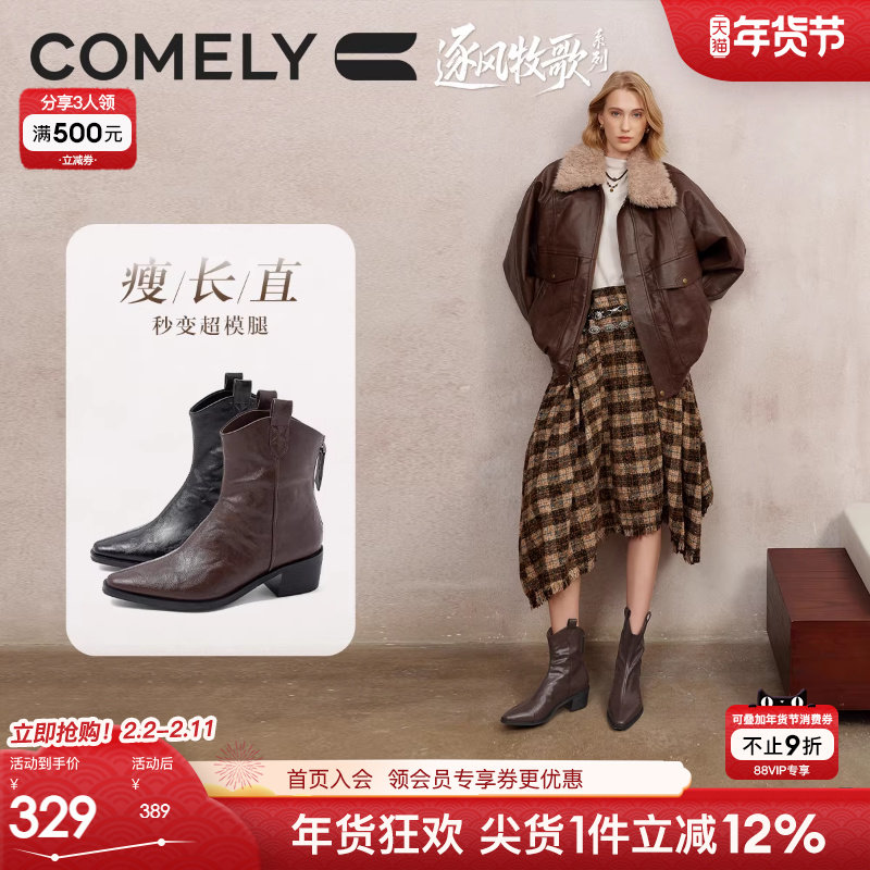 康莉美式复古西部牛仔靴女冬季新款粗跟尖头骑士靴小个子增高短靴