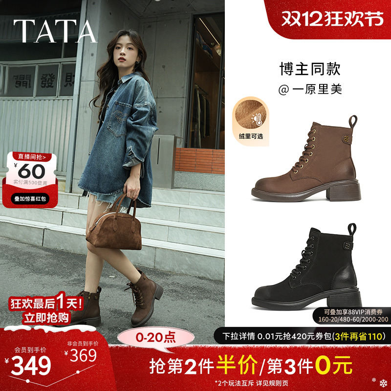 Tata他她牧野山林粗跟复古马丁靴羊皮短靴子加绒增高女鞋WZQ02DD4