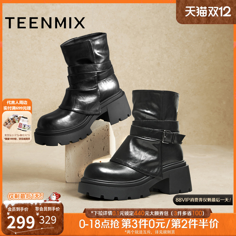 天美意复古方头粗跟加绒时装靴短靴女鞋子高跟鞋皮靴2025冬季新款