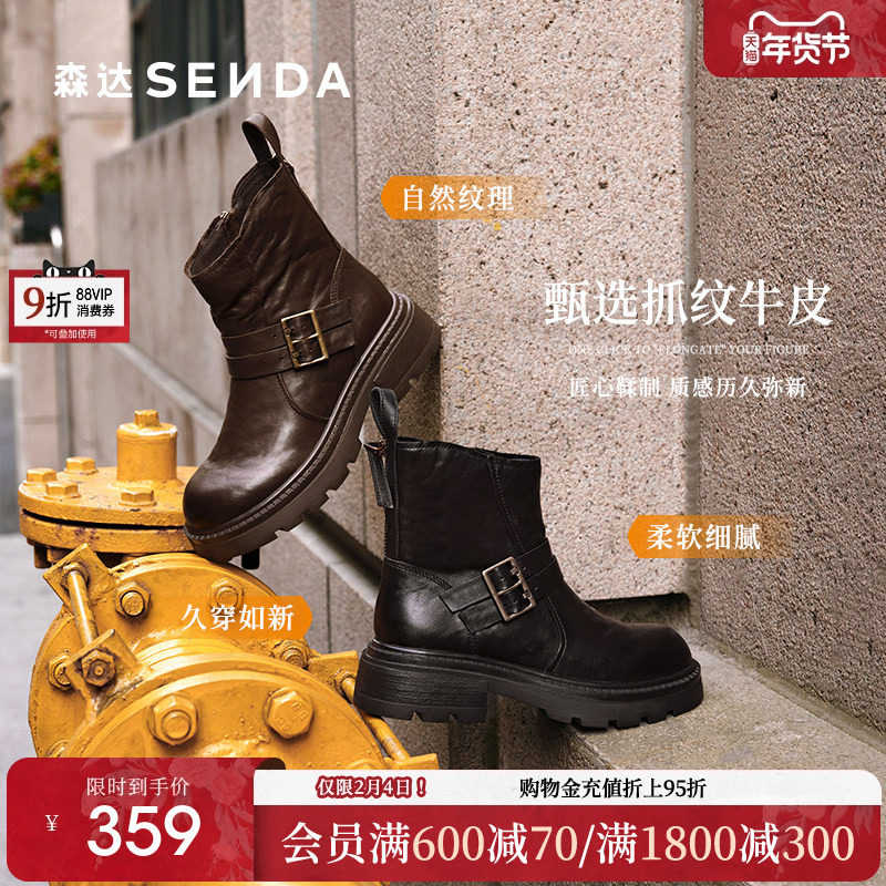 森达复古手抓牛皮时装靴女25冬新商场同款厚底粗跟短靴子XTJ01DZ5