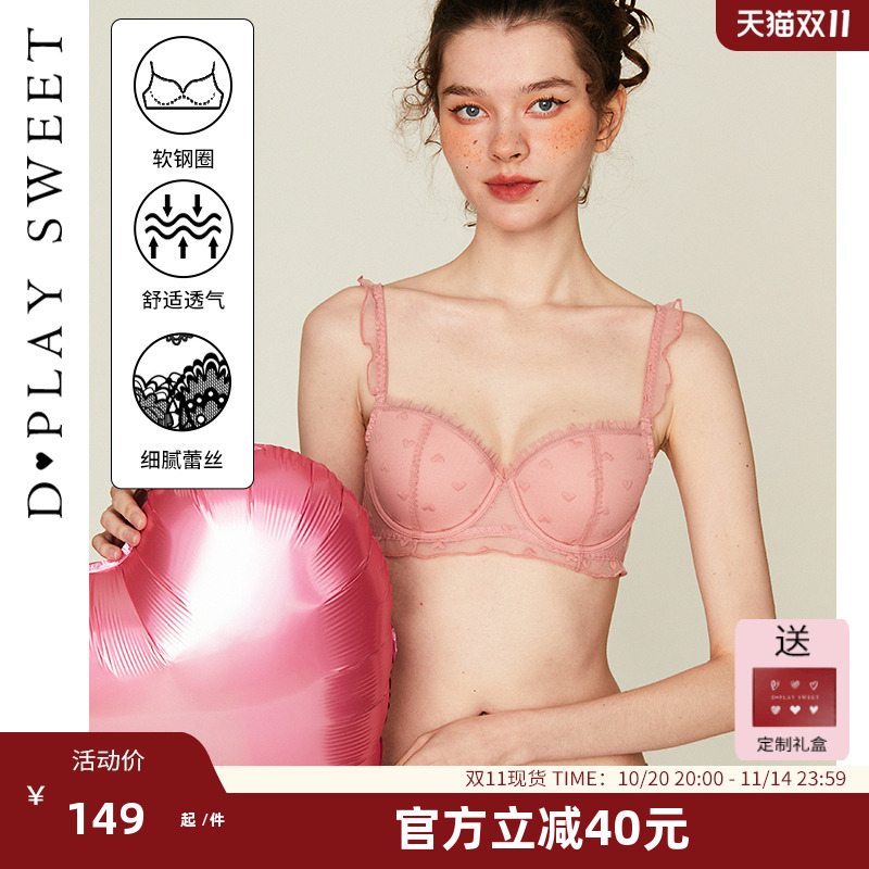 DPLAYSWEET甜美粉色爱心网纱性感女士内衣大胸显小聚拢文胸套装