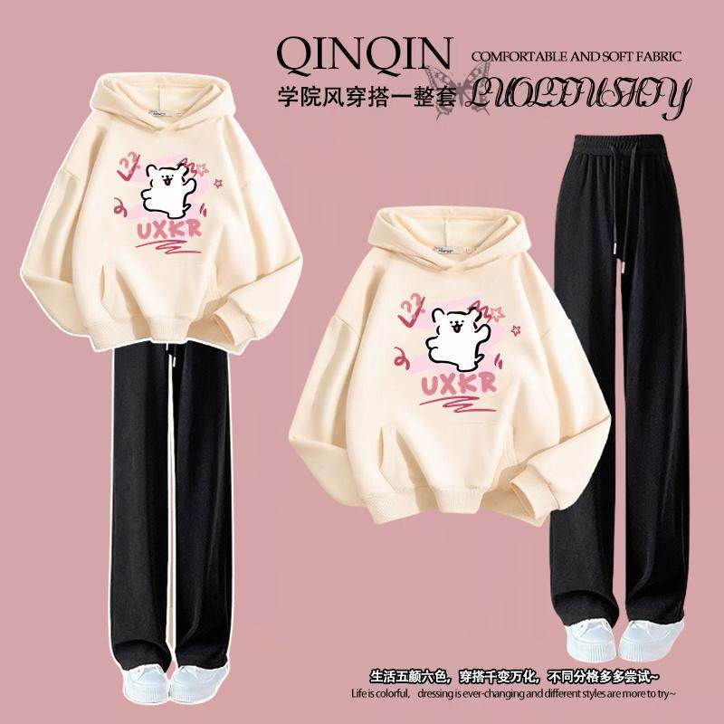 秋季百搭设计感套装女薄款连帽卫衣女高腰显瘦窄版直筒裤糯米裤子