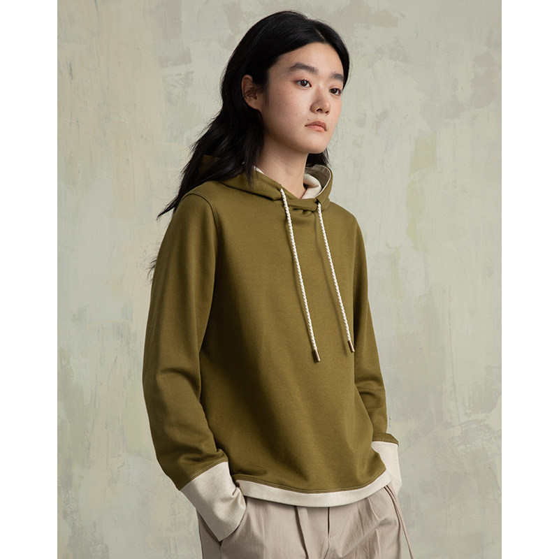 ziilam枝蓝 双色薄款连帽卫衣女春秋款绿色设计感撞色内搭上衣女