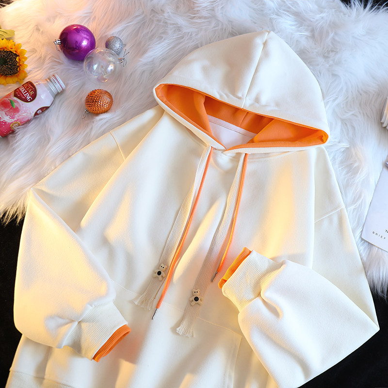 秋季薄款/纯色连帽加绒加厚冬季卫衣女学生新款宽松百搭白色外套