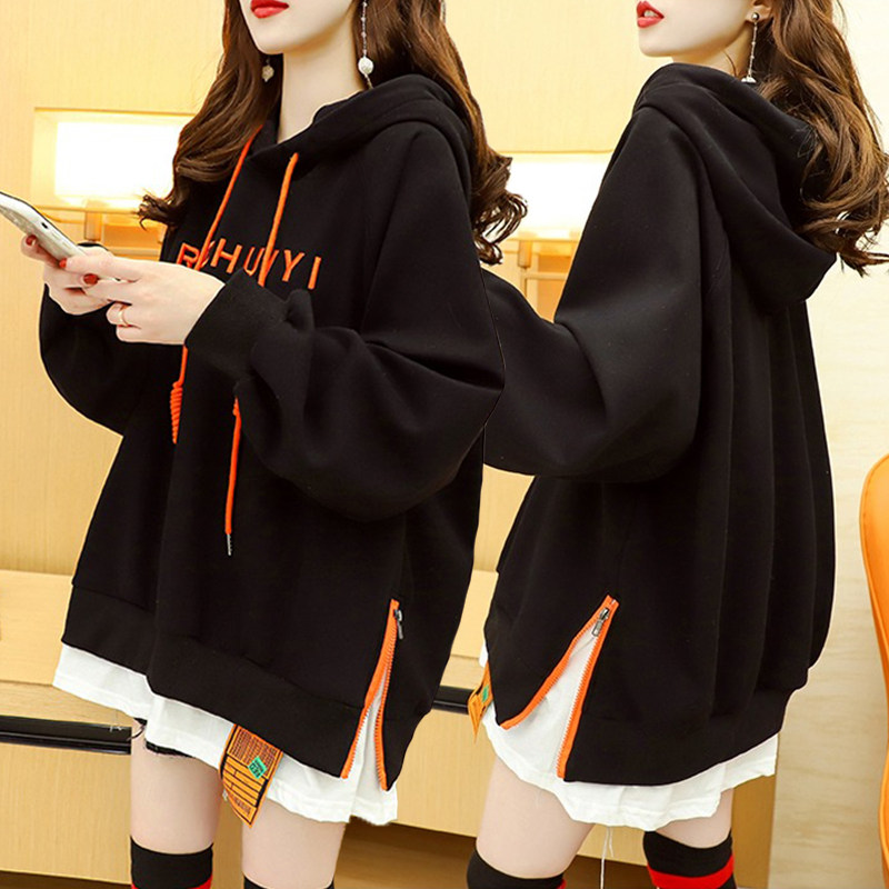 刺绣字母假两件薄款连帽卫衣女春秋新款韩版宽松百搭大码洋气上衣