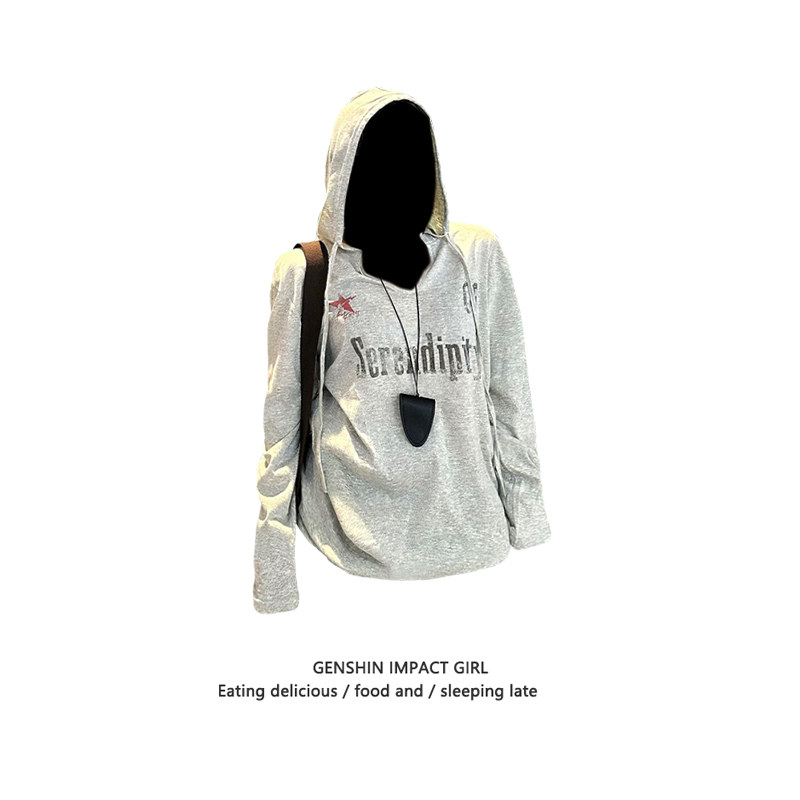 薄款连帽卫衣女美式街头做旧字母印花早秋休闲风复古V领长袖帽衫