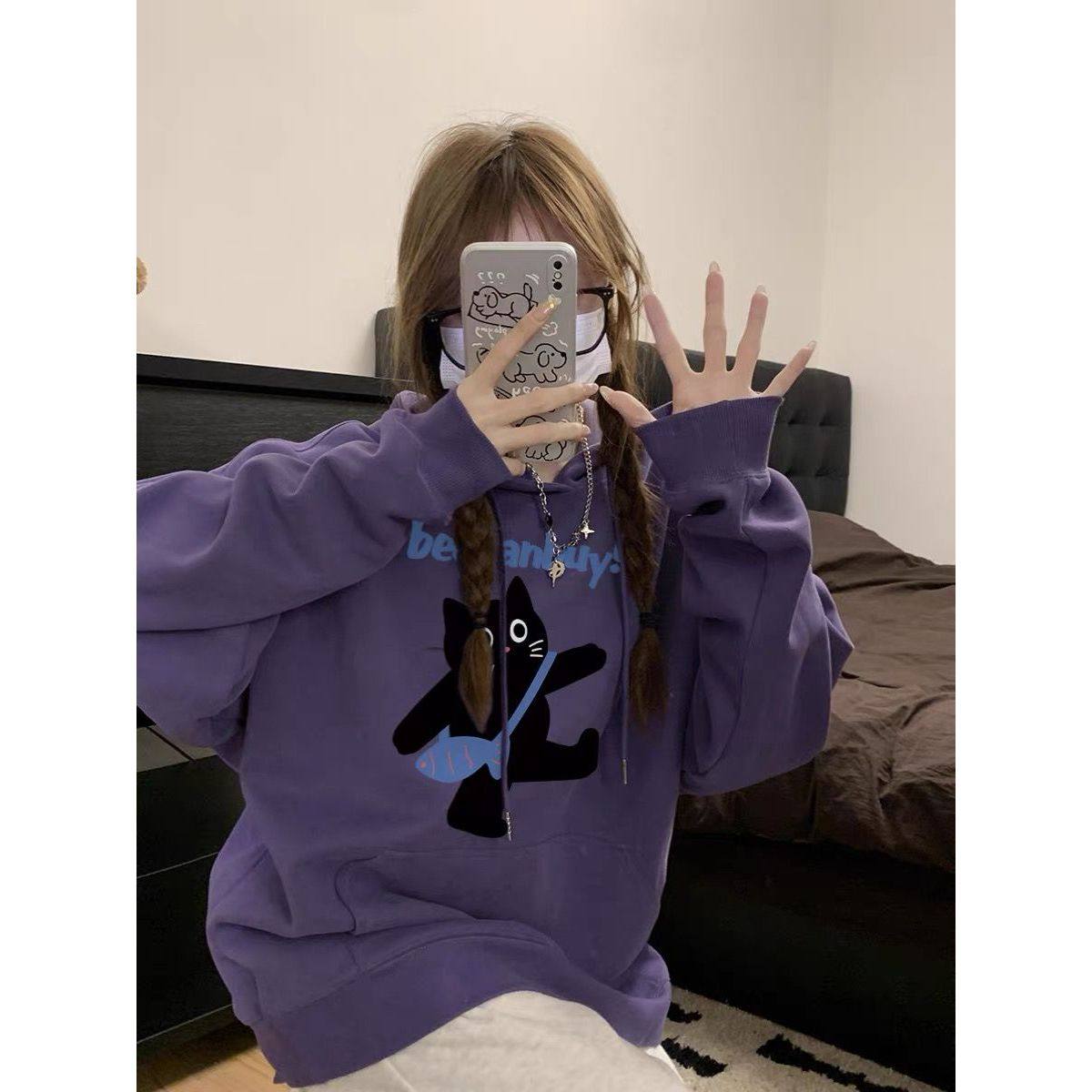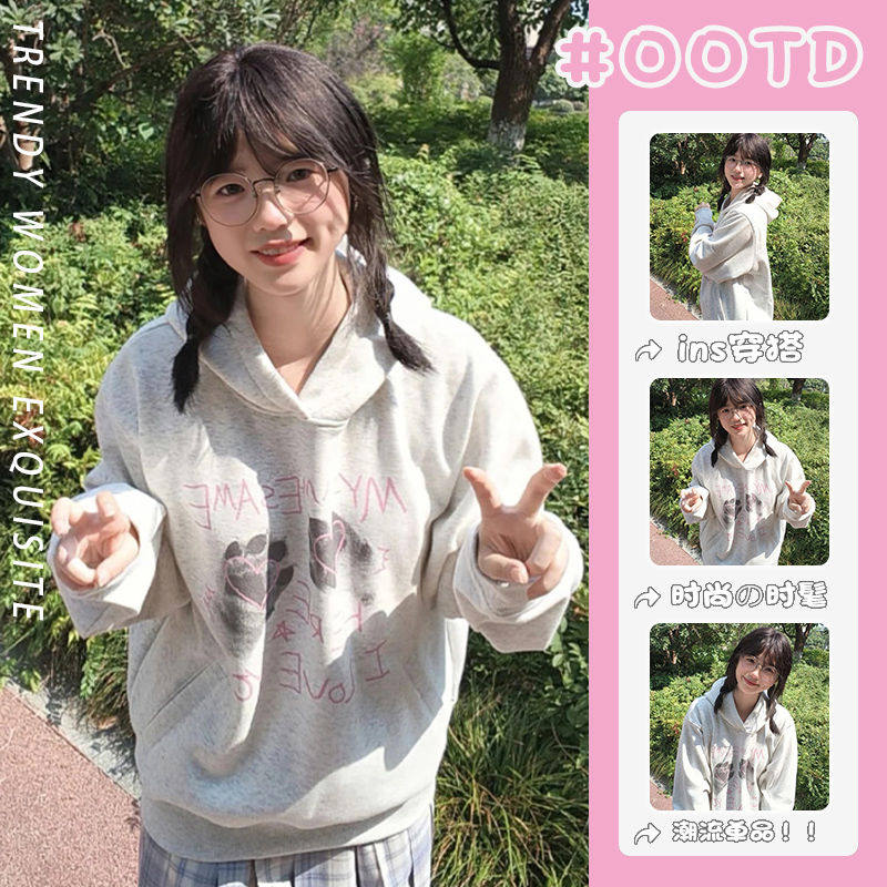 慵懒风可爱创意卡通印花早秋新款薄款连帽卫衣女小众潮牌上衣ins