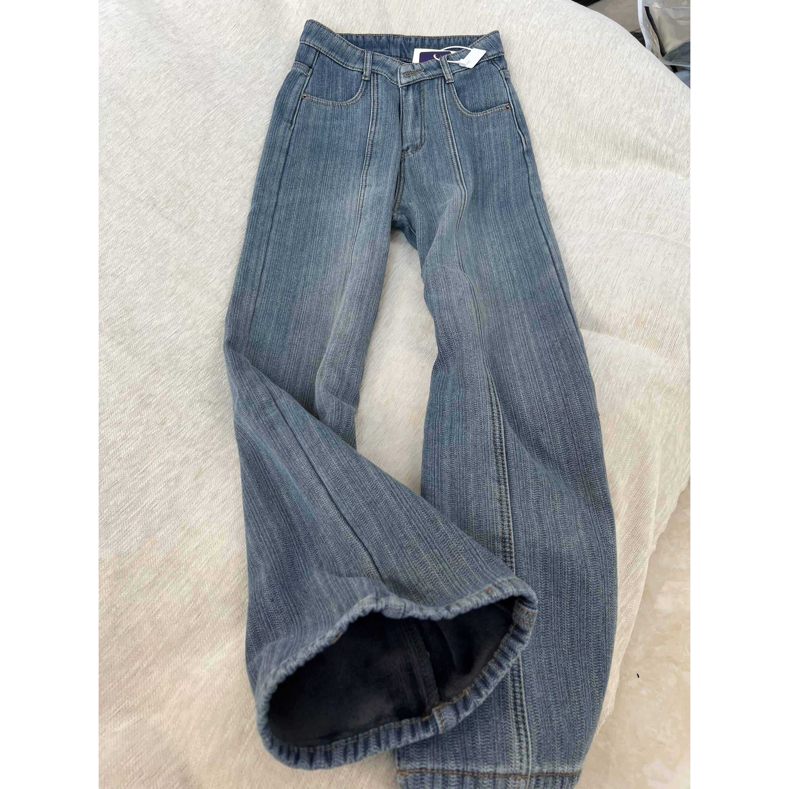 今年流行爆款加绒阔腿牛仔裤女2025秋冬新款丹宁蓝弹力直筒拖地裤