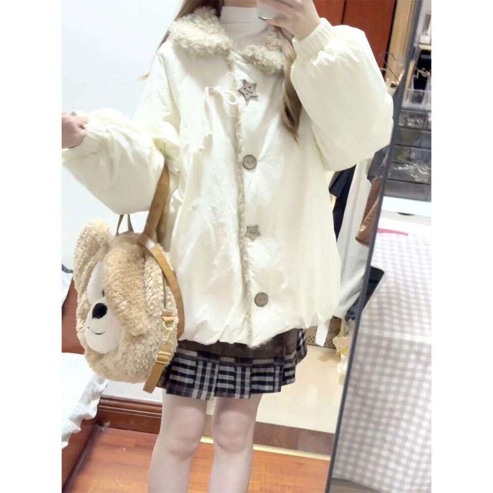 日系学院风少女羊羔毛领棉服外套女冬季新款五角星纽扣学生面包服