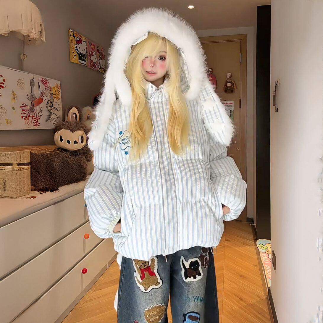 学院风条纹兔耳星星毛领连帽棉服女冬季新款百搭宽松学生棉袄外套