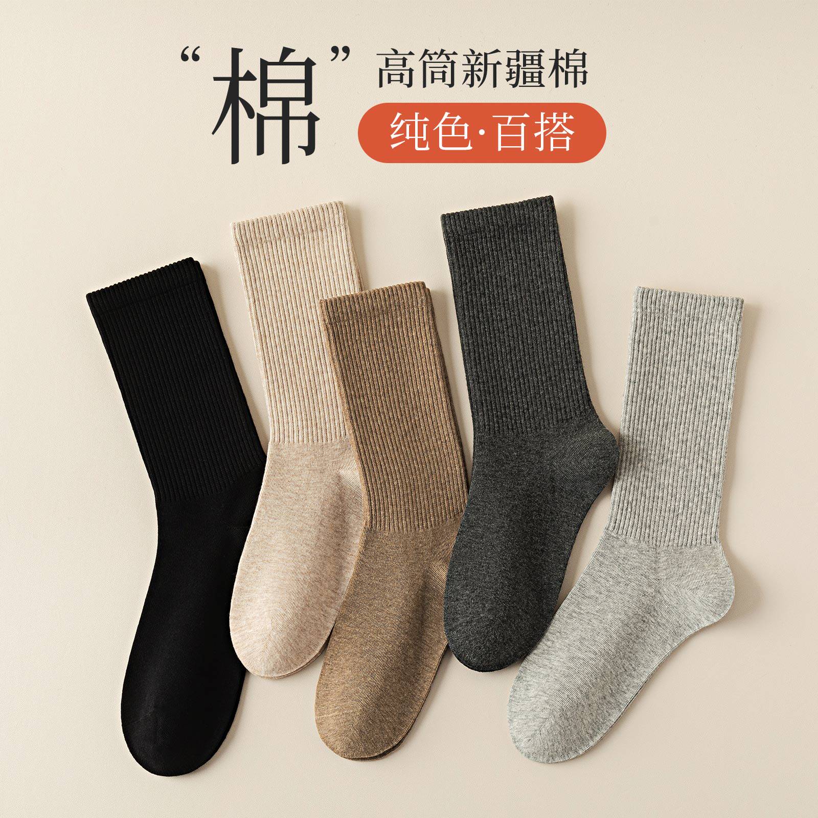 袜子女款纯棉中筒袜女士长筒袜新疆棉无骨灰色纯色配乐福鞋秋冬天