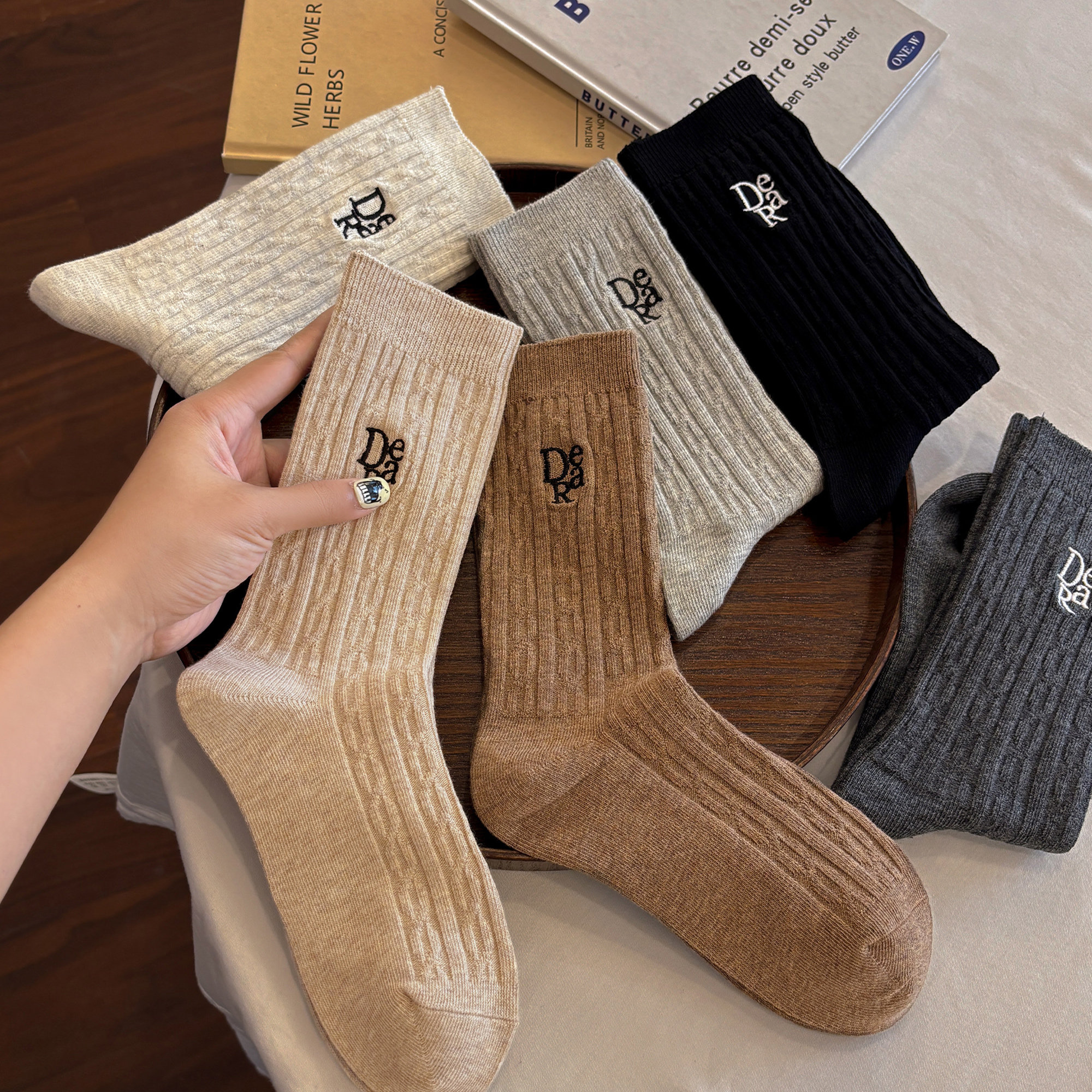咖色袜子女款秋冬季刺绣蝴蝶结中筒袜2025新款纯棉美拉德色系长袜