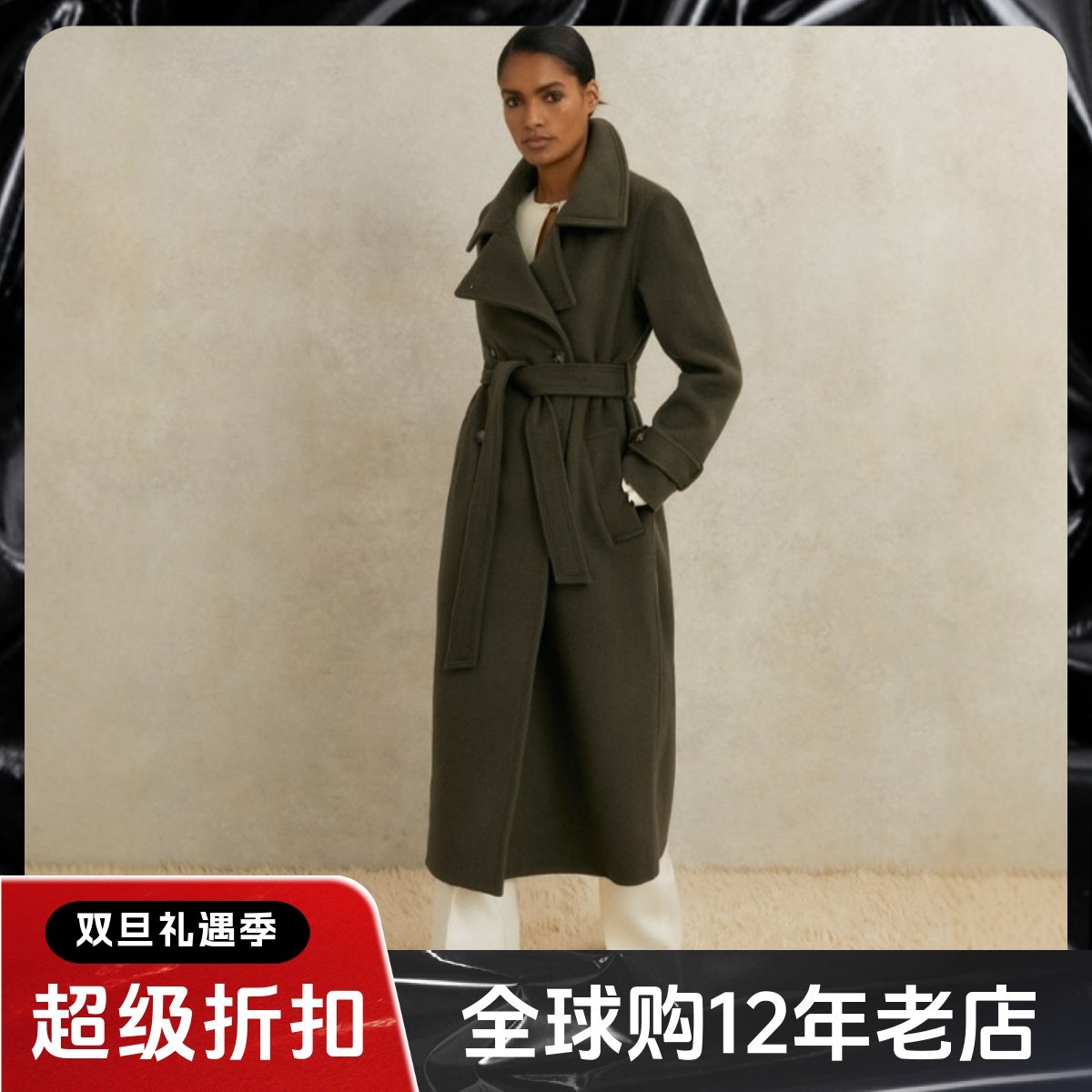 REISS纯羊毛大衣毛呢大衣军绿色中长款西服领系带双排扣气质英伦