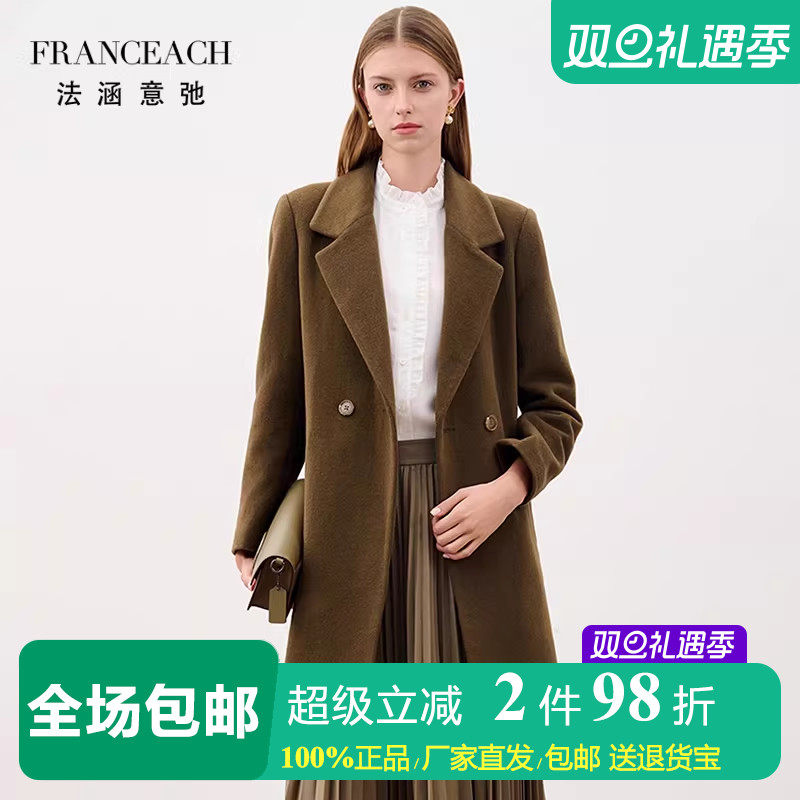 法涵意弛黑色加厚中长款西装领羊毛大衣女军绿色气质简约毛呢外套