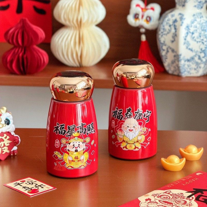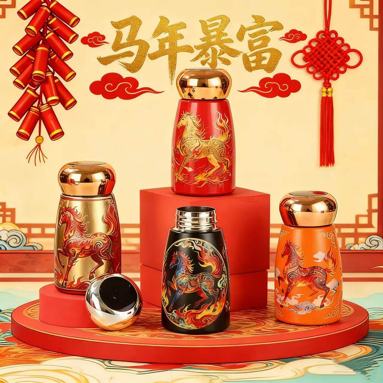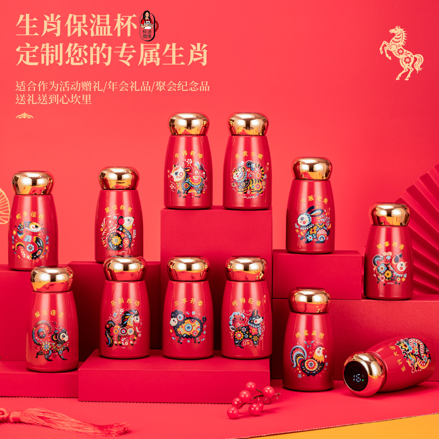 马年显温不锈钢保温杯便携小胖丁小巧蘑菇杯手绘十二生肖国风冬天