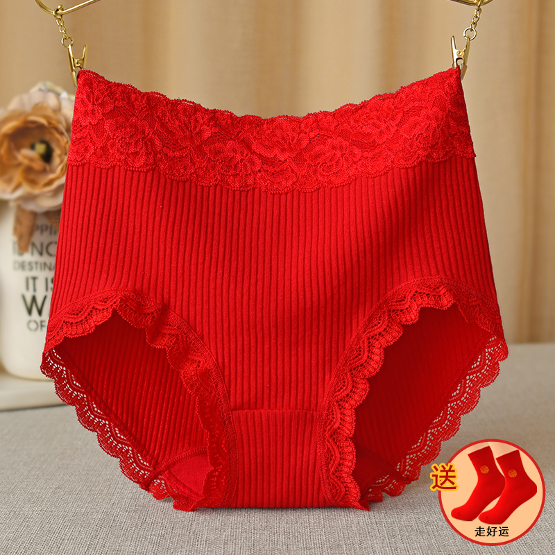 4条礼盒装本命年大红色内裤女高腰包臀大码棉裆性感蕾丝三角裤头