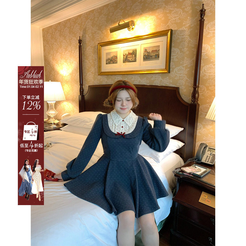 安妮不火 假两件波点印花绑带呢子连衣裙女微胖大码收腰千金风裙