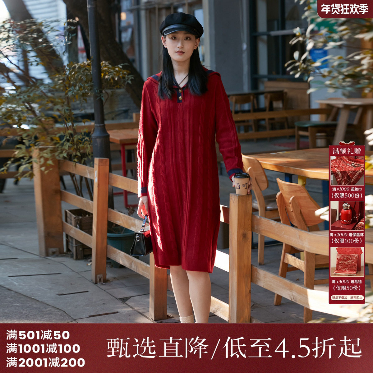 西町村屋连衣裙女冬新款学院风复古撞色OP纽花针织长裙AD8501001
