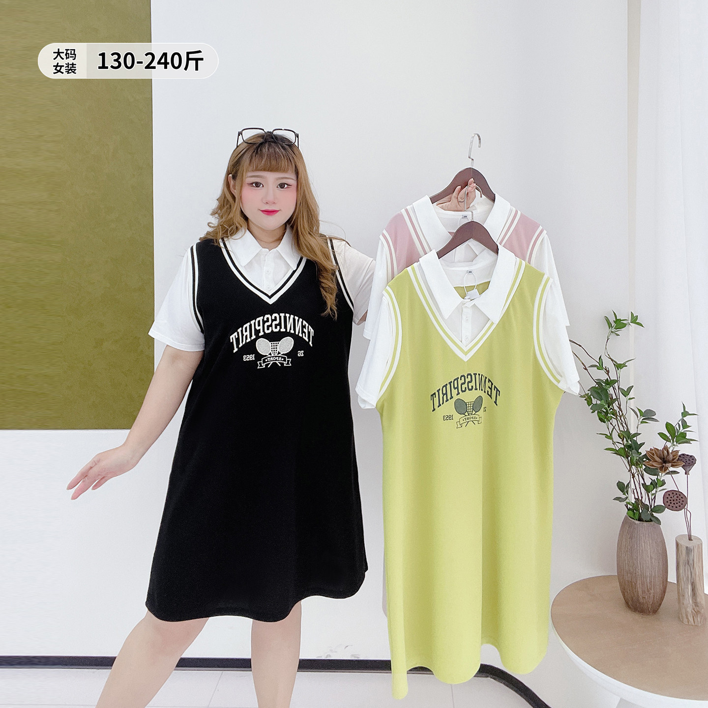 学院风假两件长裙胖莹莹大码女装夏polo领显瘦减龄撞色印花连衣裙