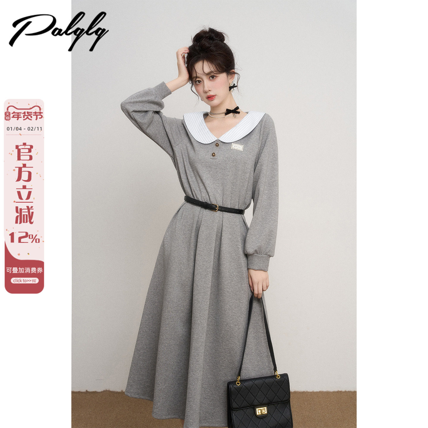 学院风娃娃领灰色长款连衣裙女秋季高级感气质休闲显瘦卫衣裙长裙