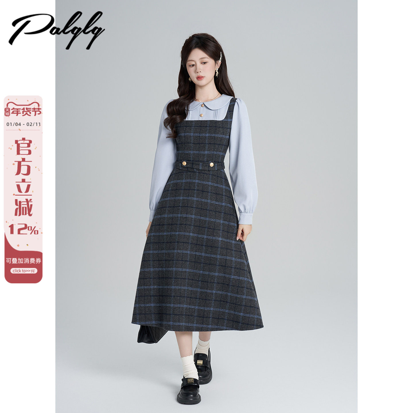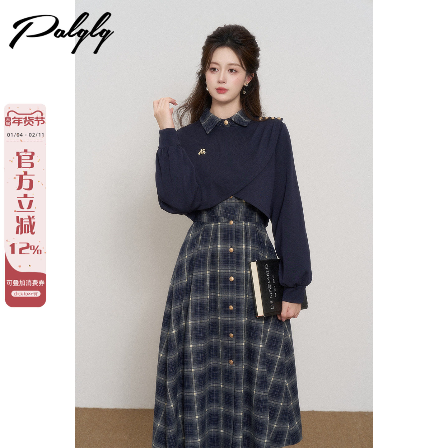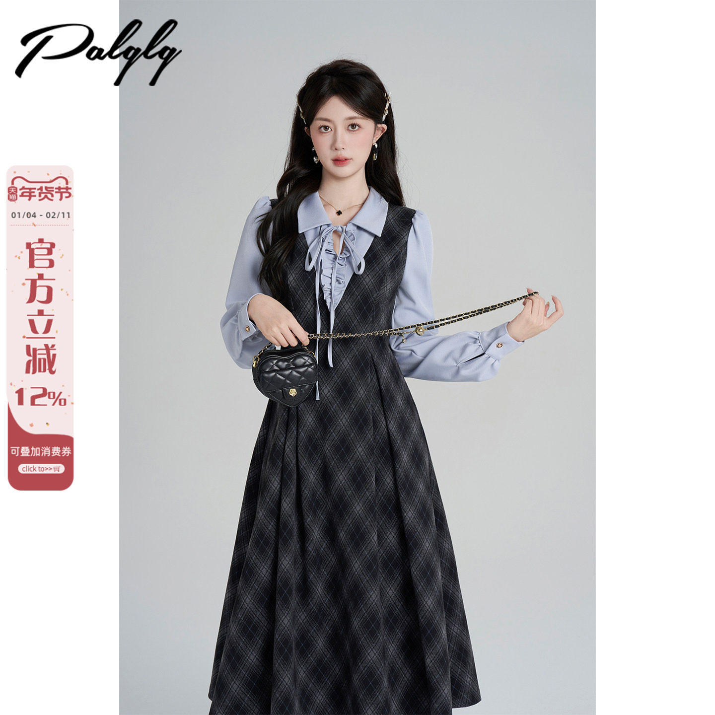 Palglg法式学院风蓝色格子收腰加厚连衣裙女冬小香风气质大摆长裙
