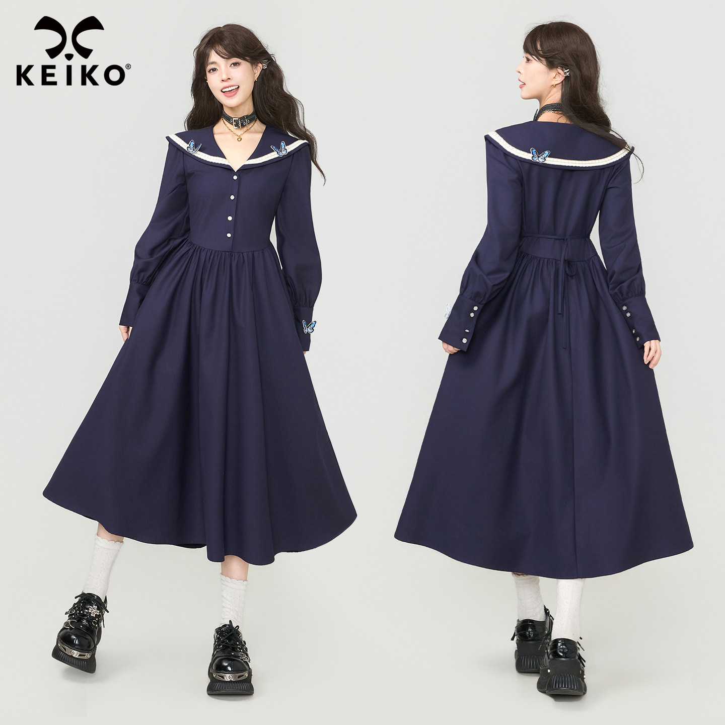 KEIKO 气质法式海军领连衣裙春季学院风垂坠缎感系带收腰显瘦长裙