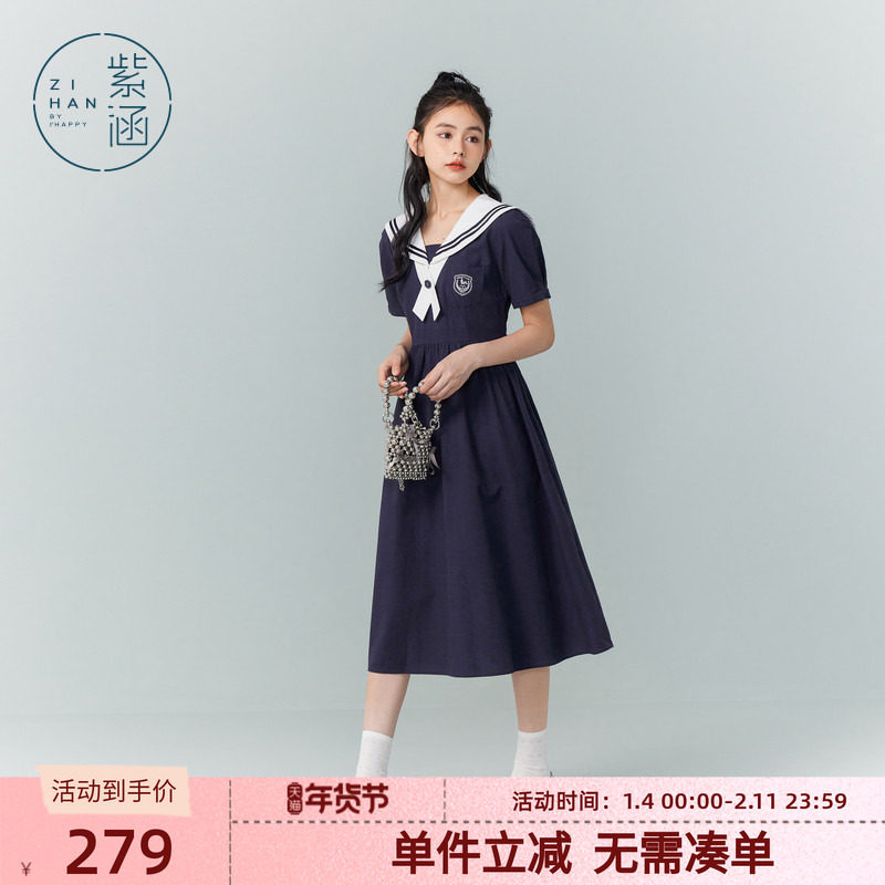 紫涵学院风连衣裙女夏季新款日系休闲海军领系带收腰短袖中长裙子