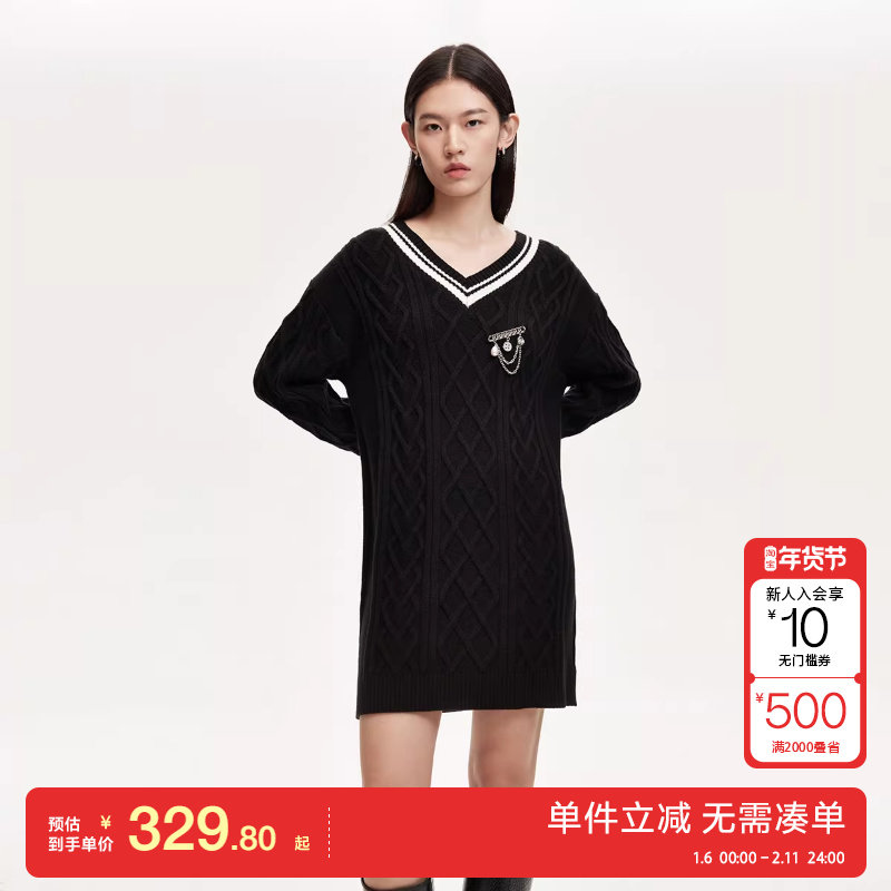 Vero Moda奥莱针织连衣裙秋冬新款V领中长裙学院风复古宽松流行