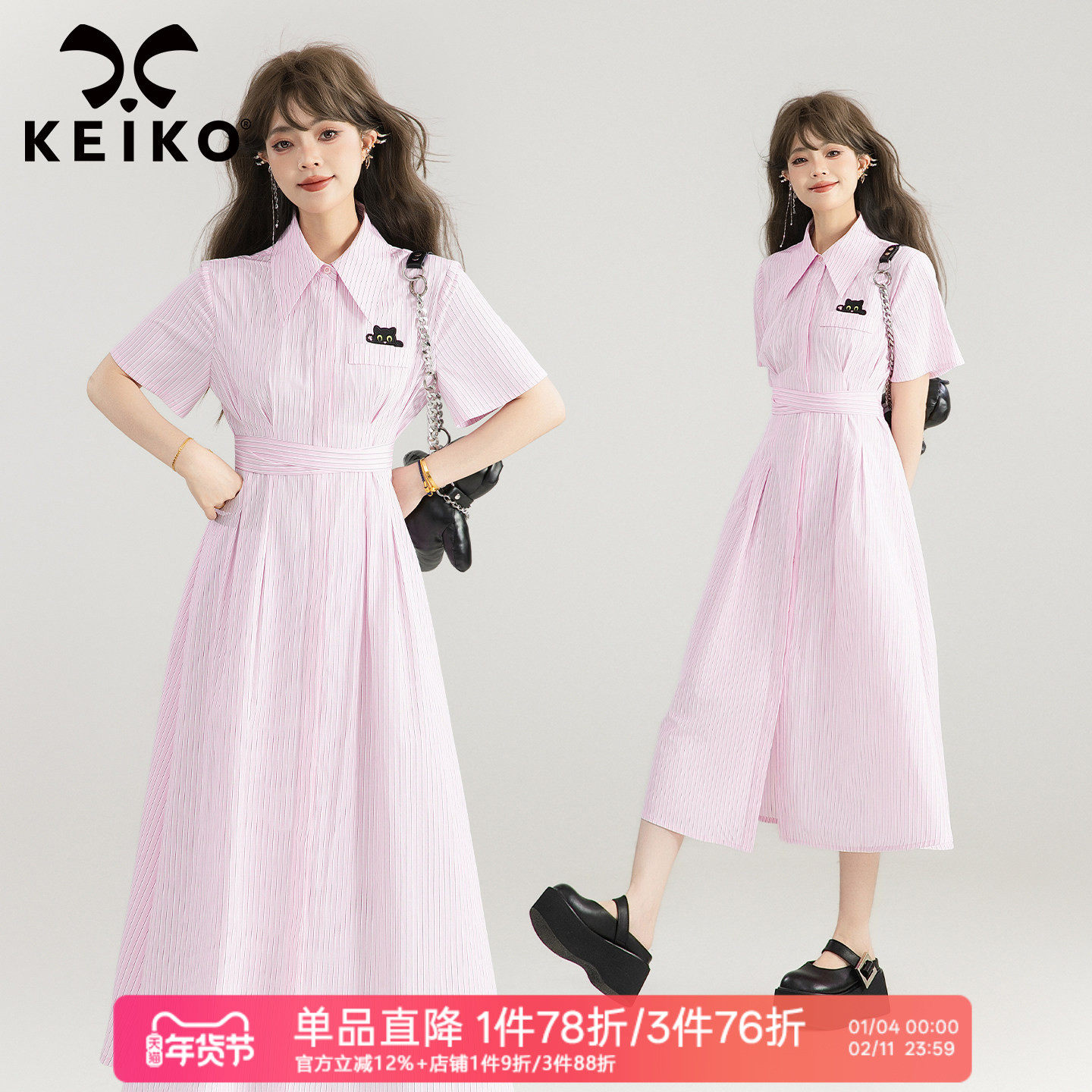 KEIKO 极简通勤风粉色条纹衬衫连衣裙春夏学院风系带收腰显瘦长裙