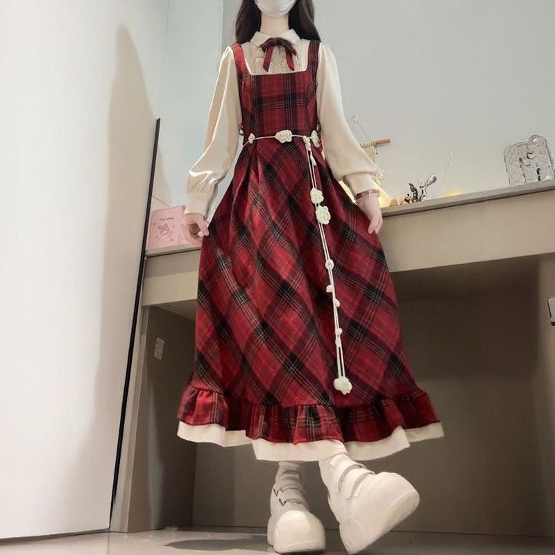 甜美学院风假两件格纹红色连衣裙女学生圣诞复古显瘦长袖a字长裙