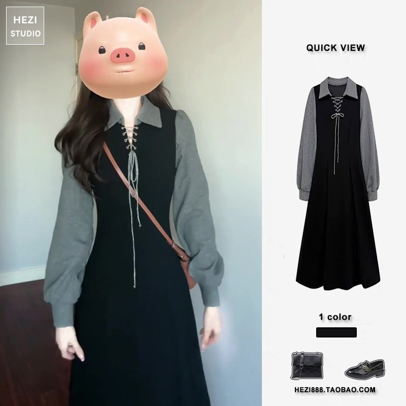 法式学院风假两件拼接气质长裙高级感收腰polo翻领打底连衣裙秋冬