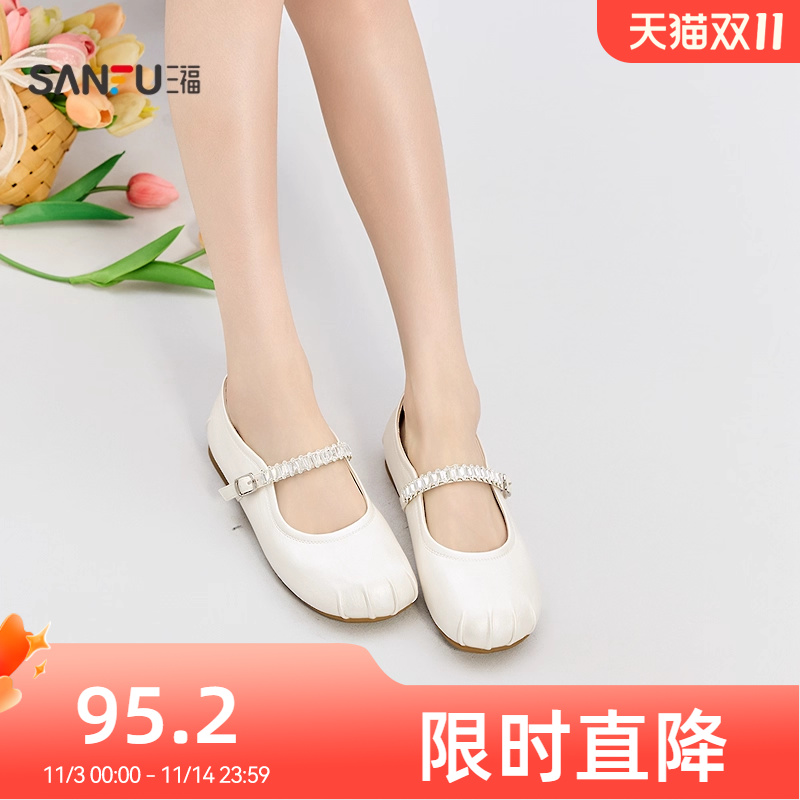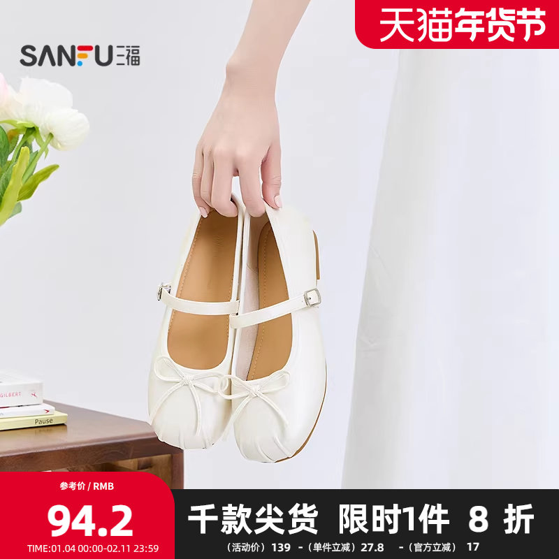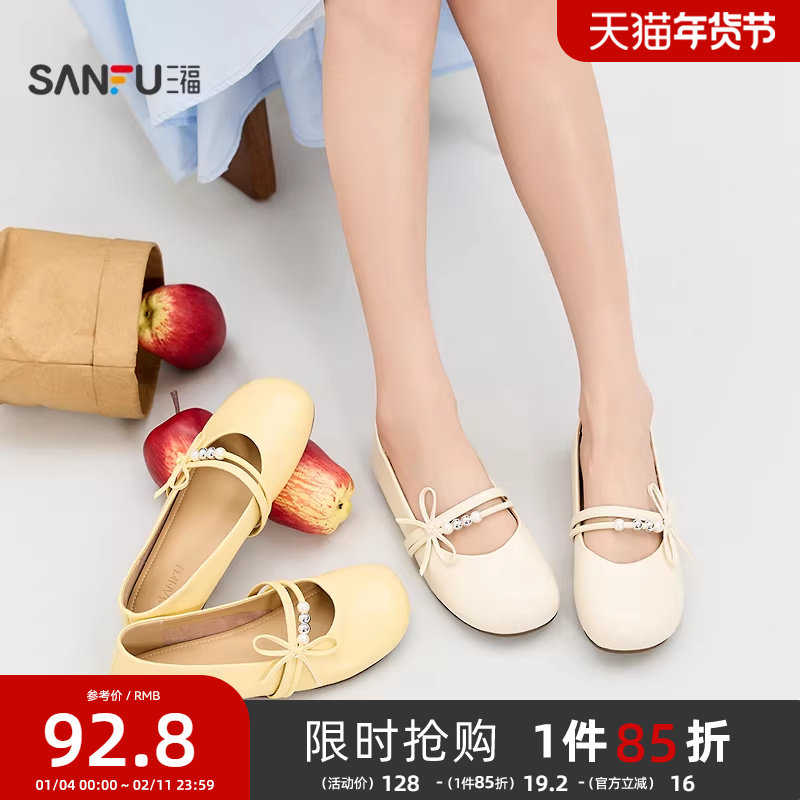 三福单鞋秋季韩系气质蝴蝶结薄底淑女鞋休闲娃娃鞋女鞋844711
